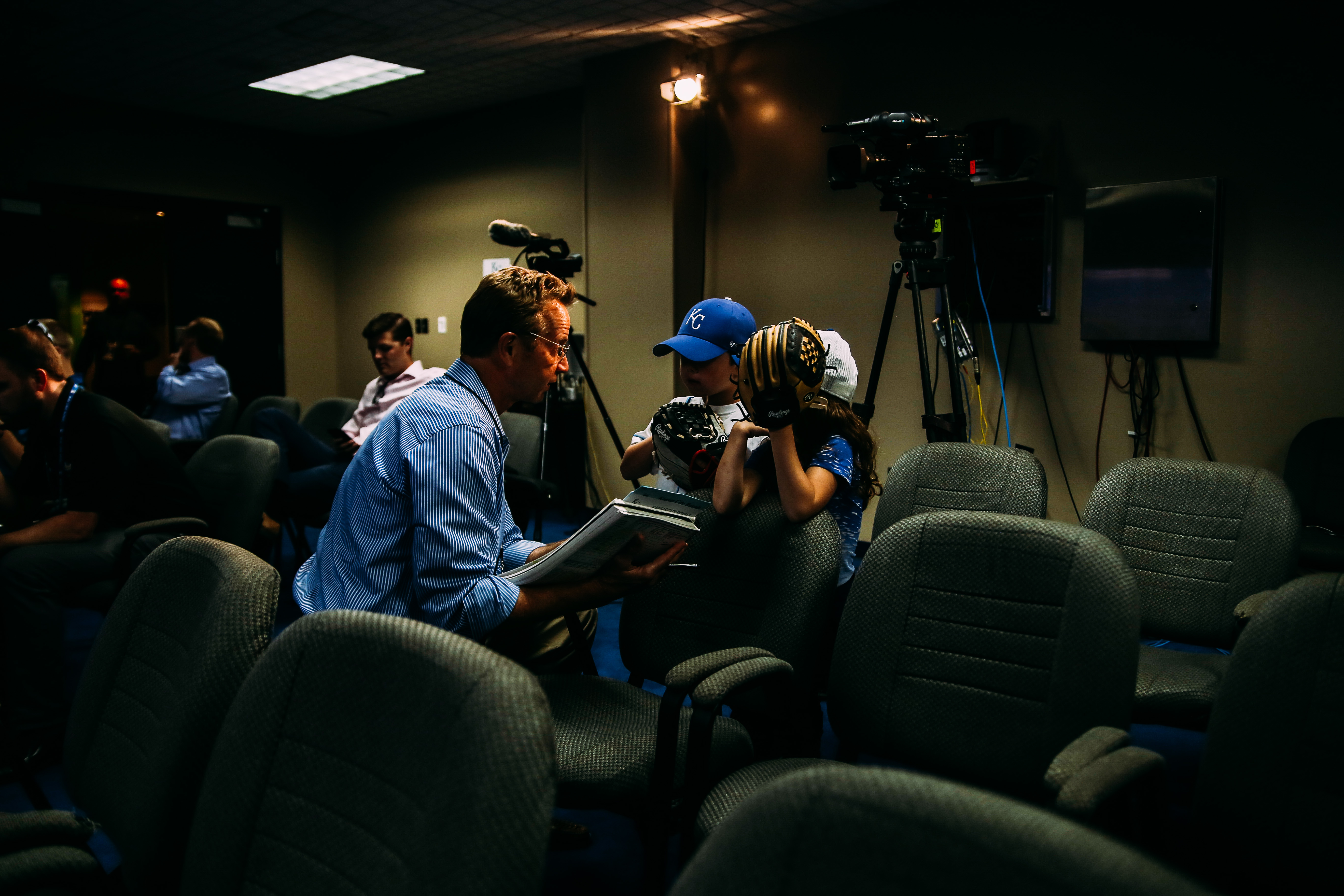 We then headed down into the lower level of the stadium and peeked our heads into the Royals clubhouse before heading into the media room. There to greet us at the door was Joel Goldberg. {Now, if you’re not a Royals fan, you may not recognize some of these names I’ll throw at you, but trust me, they’re a big deal}. In that room we also bumped into Rex Hudler and Ryan Lefebvre. We had a seat and a few miuntes later Steve Physioc came and sat down beside us. Now, if you don’t know, Steve is a broadcaster who is known for keeping amazing game stats. He brought his score book with him to show Tucker. It’s one of the most beautiful things I’ve ever seen. He was his own symbolic language he uses to keep record of everything happening in the game. Of course, my little mathmatician was just eating it up! He caught on quickly and was able to read back the special language to Phys. I think Steve was impressed and he decided to tear out one of the game sheets and give it to Tucker to keep. That’s going in a frame on the wall!