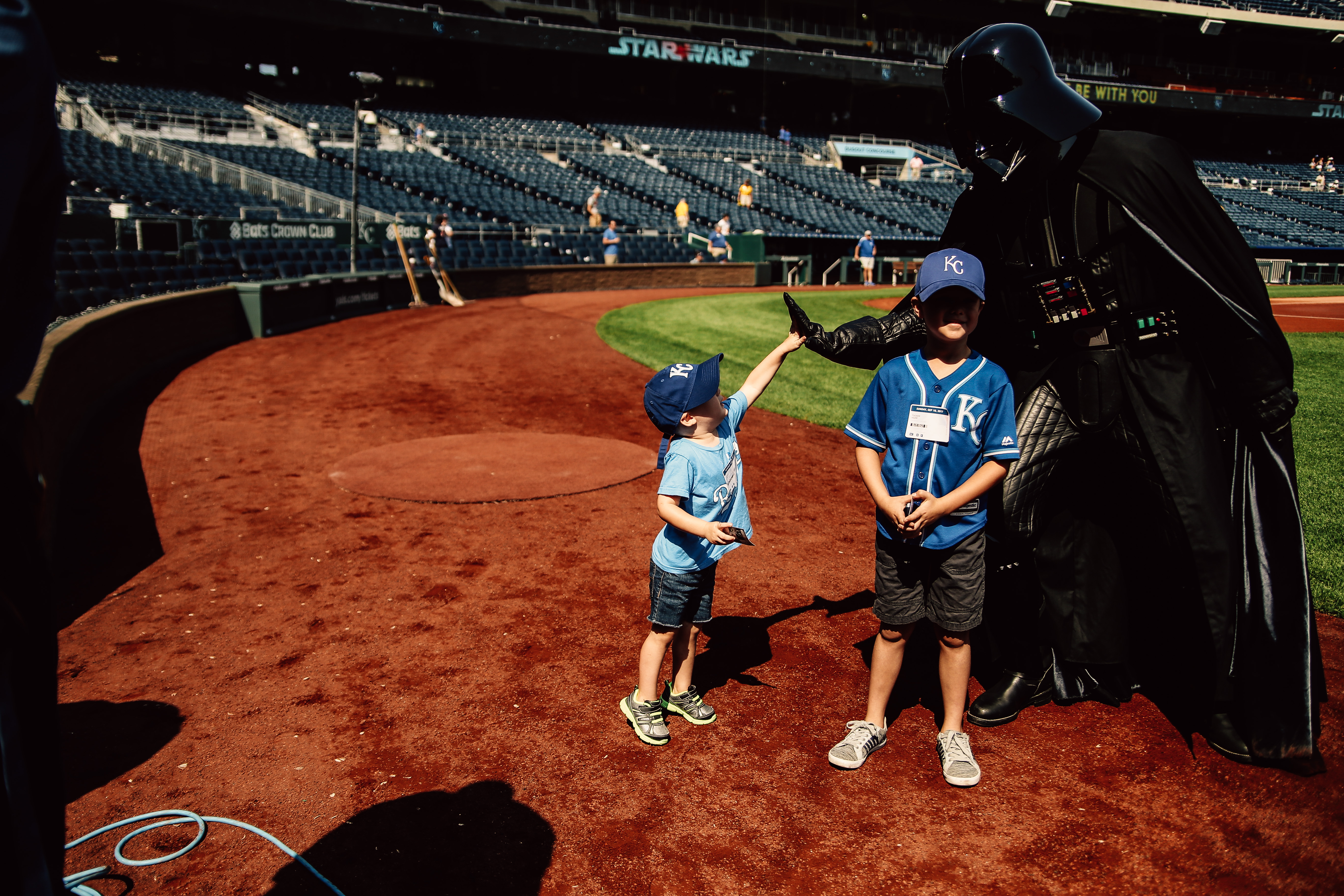 As I mentioned at the end of my post about our Dream Factory day, towards the end of our time in the dugout, one of the Royals staffers noticed Tucker’s Star Wars pump belt. She whispered to me “Is he a big Star Wars fan?” My answer: “He was Darth Vader for Halloween last year and still wears the costume weekly.” She told me that Sunday {just a couple days later} is Star Wars Day at The K {that’s Kauffman Stadium, where the Royals play, in case you didn’t know} and asked if I thought he’d like to come back and meet some of the Star Wars characters that will be there in costume.