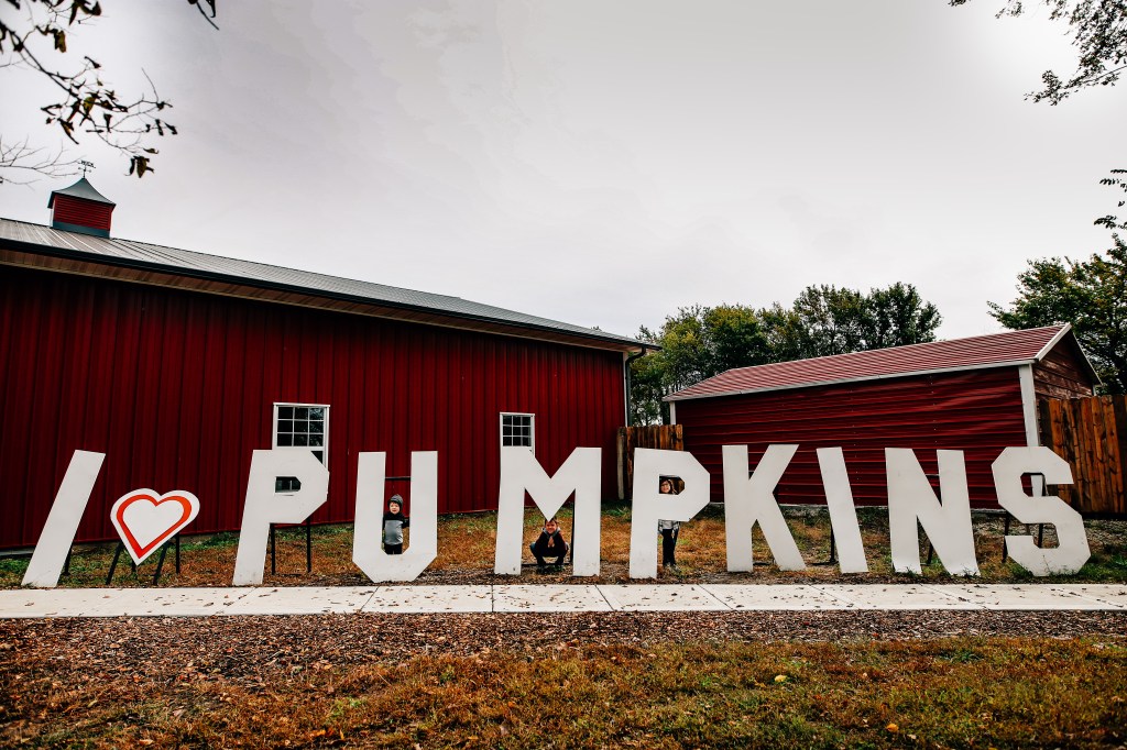 This sign was adorable and it was funny to try to direct the kids to stand in a certain letter, especially the 2 y/o who really doesn’t know letters, but yet I’m like “Grady, stand under the M! No, the M. THE M!” Duh. And, we do heart pumpkins!