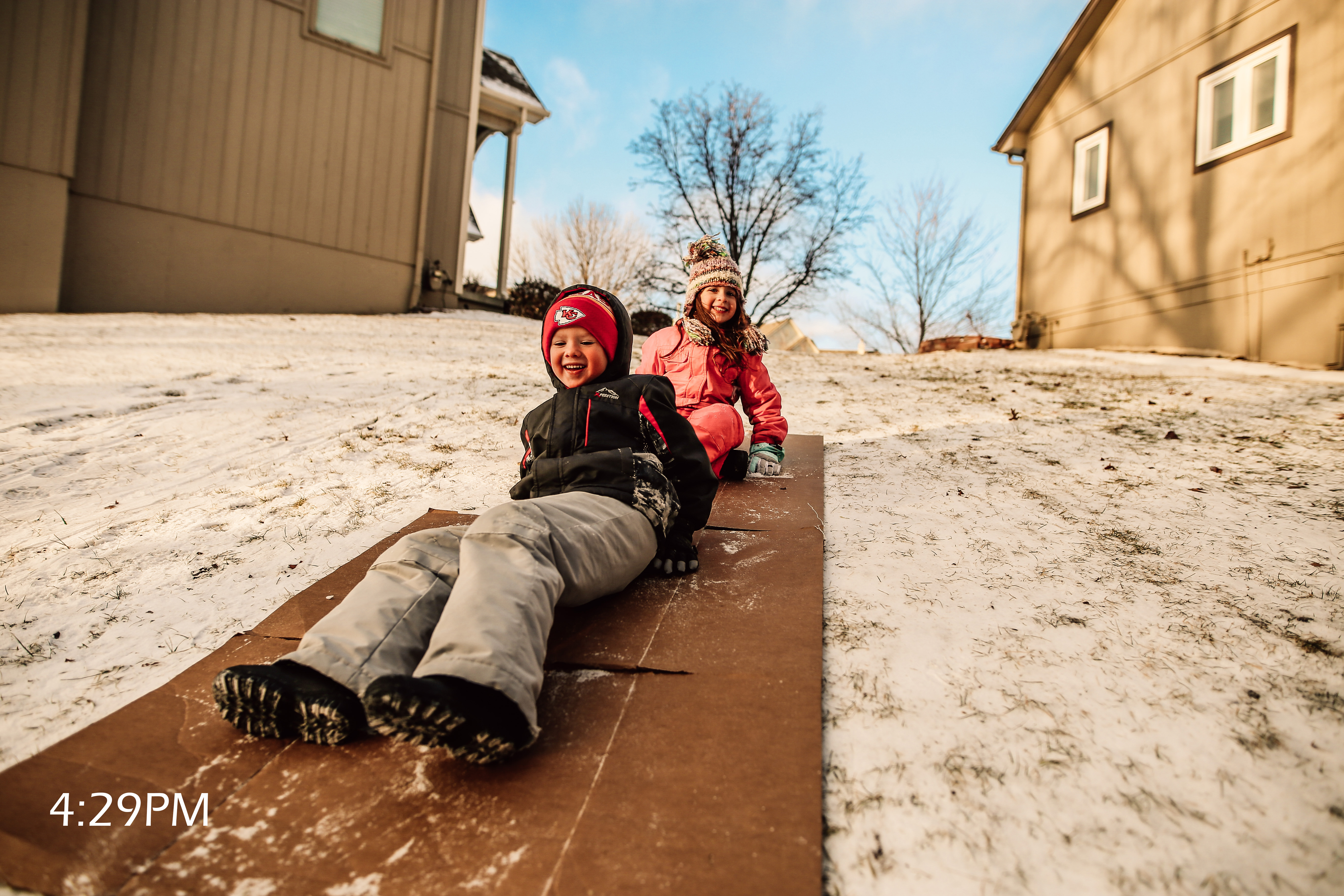 The big kids started getting a little antsy again so while the baby slept {hallelujah!} they got to head outside for a bit, again. I think that cold air put a spring in their step and some sort of magic happened. They worked together to craft a homemade sled and actually enjoyed each other’s company. I could hear the laughter from inside so I ran out as quick as I could so I could document that monumental occasion.