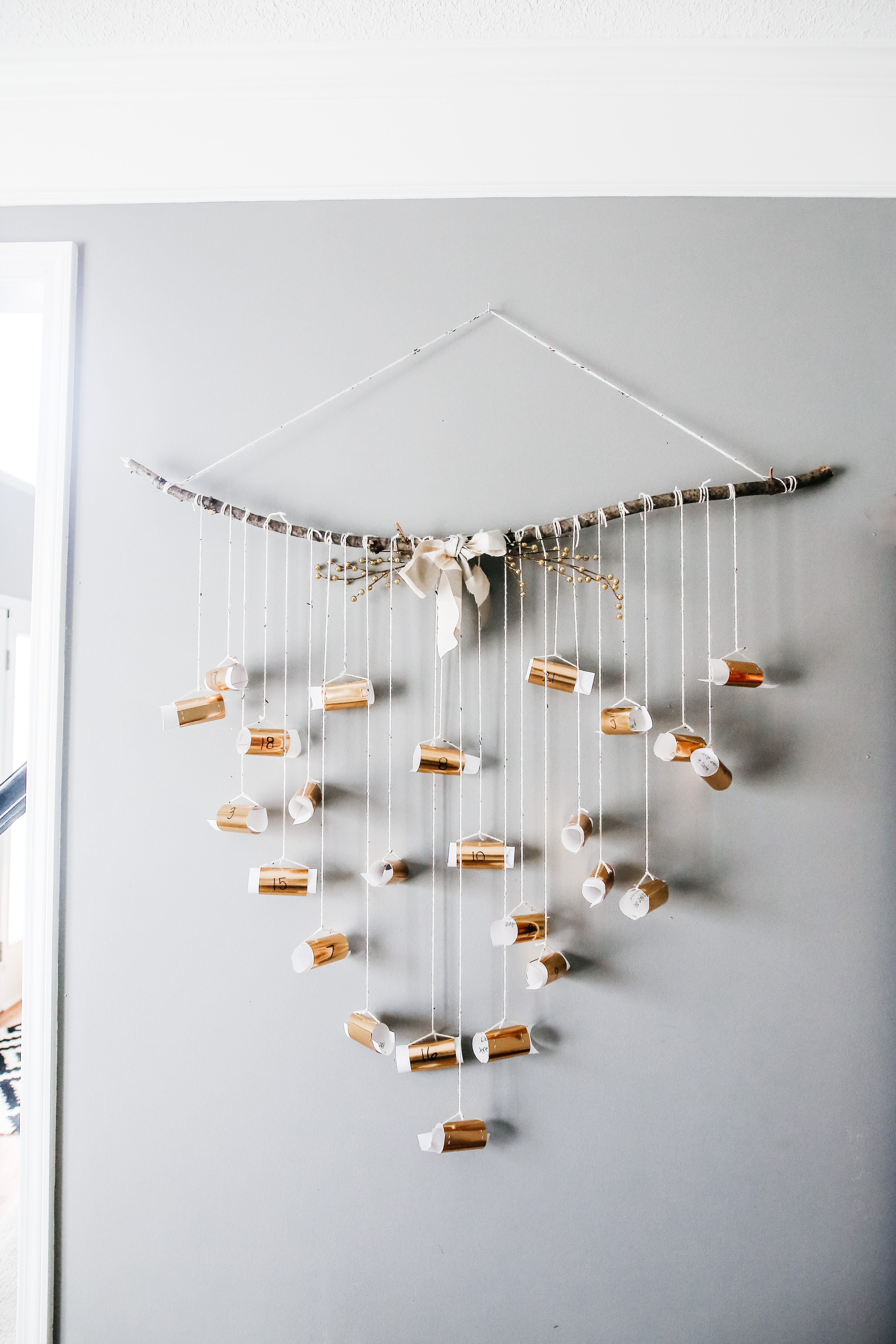 During our move this summer we had to pitch the branch and string calendar as it had become a tangled mess. New house, new calendar! Here is what I created this year; similar design, but a little smaller scale.